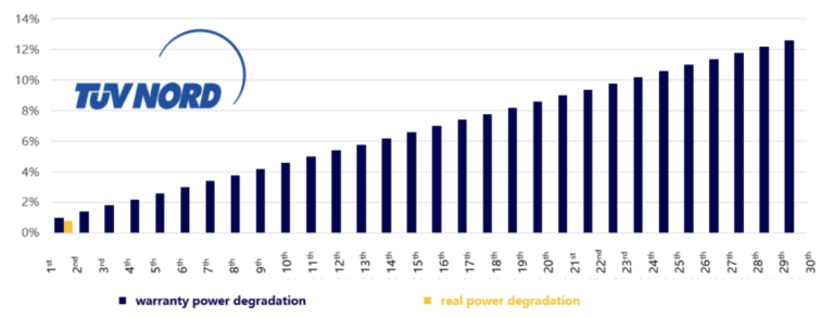 Seuraava kuva osoittaa tuloksia TÜV Nordin sertifioimasta kenttätestistä Mohe PV -voimalassa Heilongjiangin maakunnassa, Kiinassa. Alueella mitattiin tammikuussa 2023 poikkeuksellisen kylmä -53 °C:n lämpötila – kaikkien aikojen alhaisin mitattu arvo alueella. Vuoden käytön jälkeen DeepBlue 4.0 Pro -moduulien teho oli heikentynyt vain 0,84 %, mikä alittaa selvästi valmistajan asettaman 1 %:n ensimmäisen vuoden maksimialenemarajan.